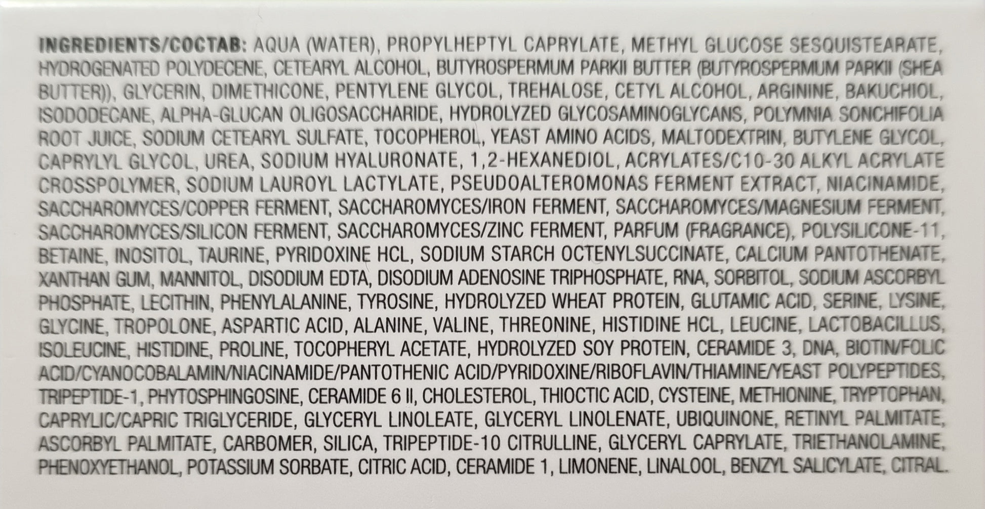 Full Ingredient List: Aqua (Water), Propylheptyl Caprylate, Methyl Glucose Sesquistearate, Hydrogenated Polydecene, Cetearyl Alcohol, Butyrospermum Parkii Butter (Butyrospermum Parkii (Shea Butter)), Glycerin, Dimethicone, Pentylene Glycol, Trehalose, Cetyl Alcohol, Arginine, Bakuchiol, Isododecane, Alpha-Glucan Oligosaccharide, Hydrolyzed Glycosaminoglycans, Polymnia Sonchifolia Root Juice, Sodium Cetearyl Sulfate, Tocopherol, Yeast Amino Acids, Maltodextrin, Butylene Glycol, Caprylyl Glycol, Urea, Sodium Hyaluronate, 1,2-Hexanediol, Acrylates/C10-30 Alkyl Acrylate Crosspolymer, Sodium Lauroyl Lactylate, Pseudoalteromonas Ferment Extract, Niacinamide, Saccharomyces/Copper Ferment, Saccharomyces/Iron Ferment, Saccharomyces/Magnesium Ferment, Saccharomyces/Silicon Ferment, Saccharomyces/Zinc Ferment, Parfum (Fragrance), Polysilicone-11, Betaine, Inositol, Taurine, Pyridoxine HCl, Sodium Starch Octenylsuccinate, Calcium Pantothenate, Xanthan Gum, Mannitol, Disodium Edta, Disodium Adenosine Triphosphate, Rna, Sorbitol, Sodium Ascorbyl Phosphate, Lecithin, Phenylalanine, Tyrosine, Hydrolyzed Wheat Protein, Glutamic Acid, Serine, Lysine, Glycine, Tropolone, Aspartic Acid, Alanine, Valine, Threonine, Histidine HCl, Leucine, Lactobacillus, Isoleucine, Histidine, Proline, Tocopheryl Acetate, Hydrolyzed Soy Protein, Ceramide 3, Dna, Biotin/Folic Acid/Cyanocobalamin/Niacinamide/Pantothenic Acid/Pyridoxine/Riboflavin/Thiamine/Yeast Polypeptides, Tripeptide-1, Phytosphingosine, Ceramide 6 II, Cholesterol, Thioctic Acid, Cysteine, Methionine, Tryptophan, Caprylic/Capric Triglyceride, Glyceryl Linoleate, Glyceryl Linolenate, Ubiquinone, Retinyl Palmitate, Ascorbyl Palmitate, Carbomer, Silica, Tripeptide-10 Citrulline, Glyceryl Caprylate, Triethanolamine, Phenoxyethanol, Potassium Sorbate, Citric Acid, Ceramide 1, Butylphenyl Methylpropional, Limonene, Linalool, Benzyl Salicylate, Citral.