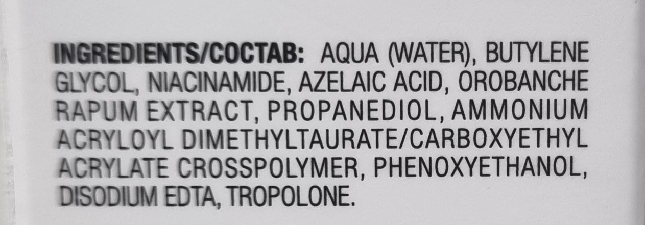 Full Ingredient List: Water, Butylene Glycol, Niacinamide, Azelaic Acid, Orobanche Rapum Extract, Propanediol, Ammonium Acryloyl Dimethyltaurate/Carboxyethyl Acrylate Crosspolymer, Phenoxyethanol, Disodium EDTA, Tropolone.