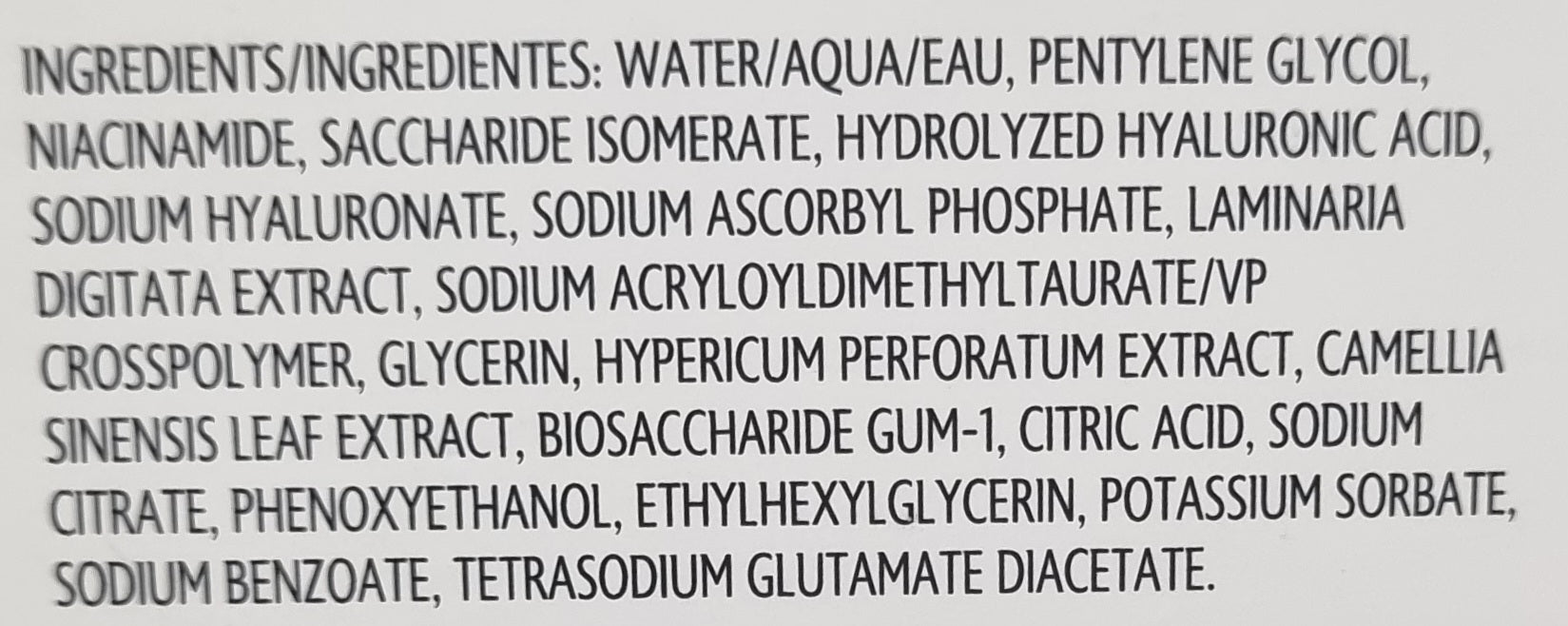 Full ingredients: Water/Aqua/Eau, Pentylene Glycol, Niacinamide, Saccharide Isomerate, Hydrolyzed Hyaluronic Acid, Sodium Hyaluronate, Sodium Ascorbyl Phosphate, Laminaria Digitata Extract, Sodium Acryloyldimethyltaurate/VP Crosspolymer, Glycerin, Hypericum Perforatum Extract, Camellia Sinensis Leaf Extract, Biosaccharide Gum-1, Citric Acid, Sodium Citrate, Phenoxyethanol, Ethylhexylglycerin, Potassium Sorbate, Sodium Benzoate, Tetrasodium Glutamate Diacetate